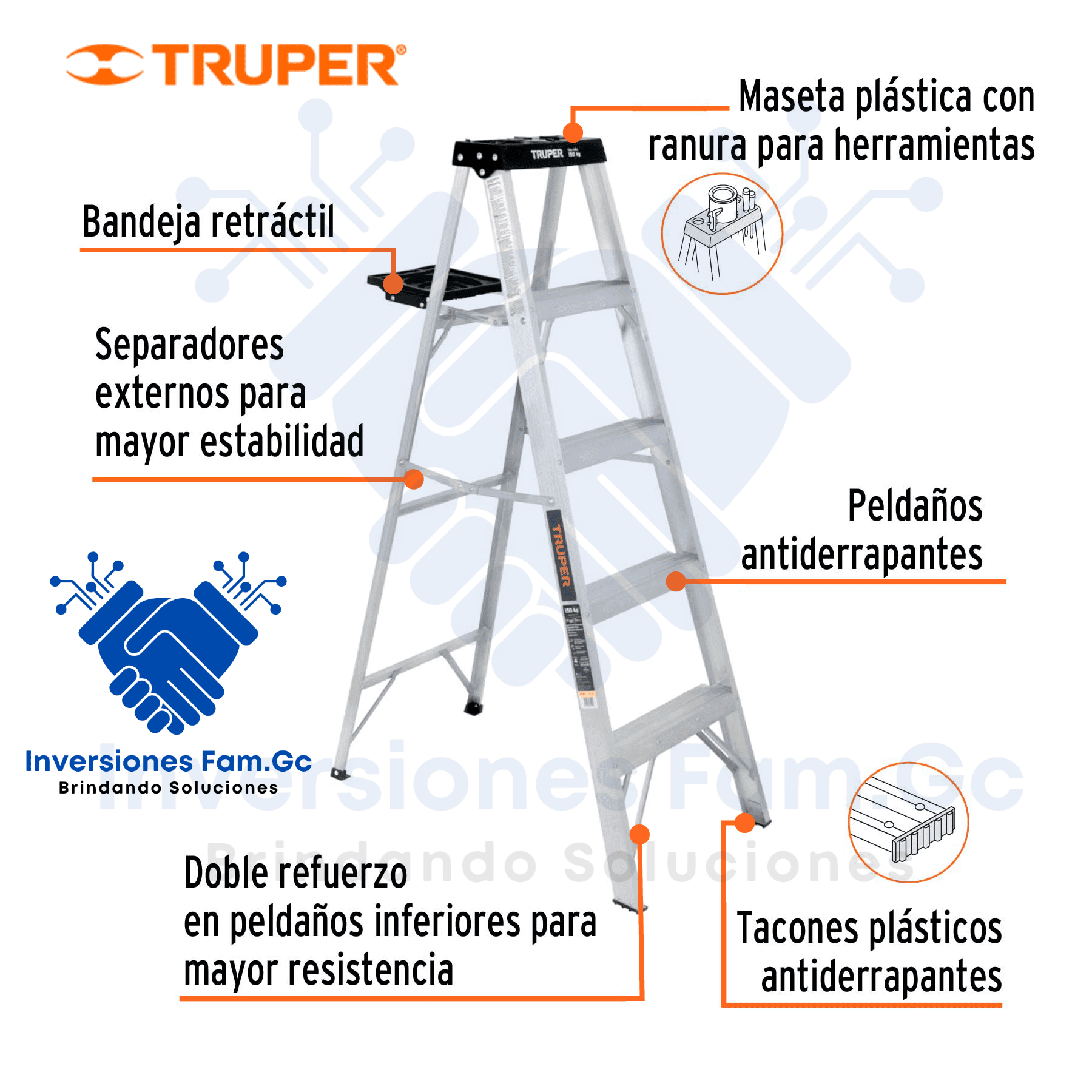 | Peldaños | 4 peldaños antiderrapantes de 2 3/4″ (7 cm). Refuerzo doble en peldaños inferiores. |